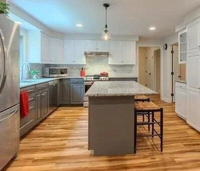 Painting cabinetry gray is another way to incorporate gray into your decor. We have used Benjamin Moore Kendall Charcoal on an island in an all white kitchen and on the lower cabinets and island in a two tone kitchen.