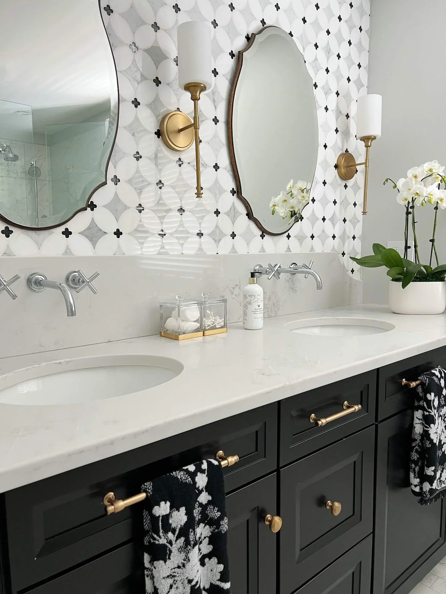 The pictures below illustrate a bold blue island in our beach house project, dramatic black cabinetry in my own kitchen refresh, a mix of wallpapers and tile patterns in an antique farmhouse primary bath renovation, and playful bold wallpaper in a beach house guest bathroom.