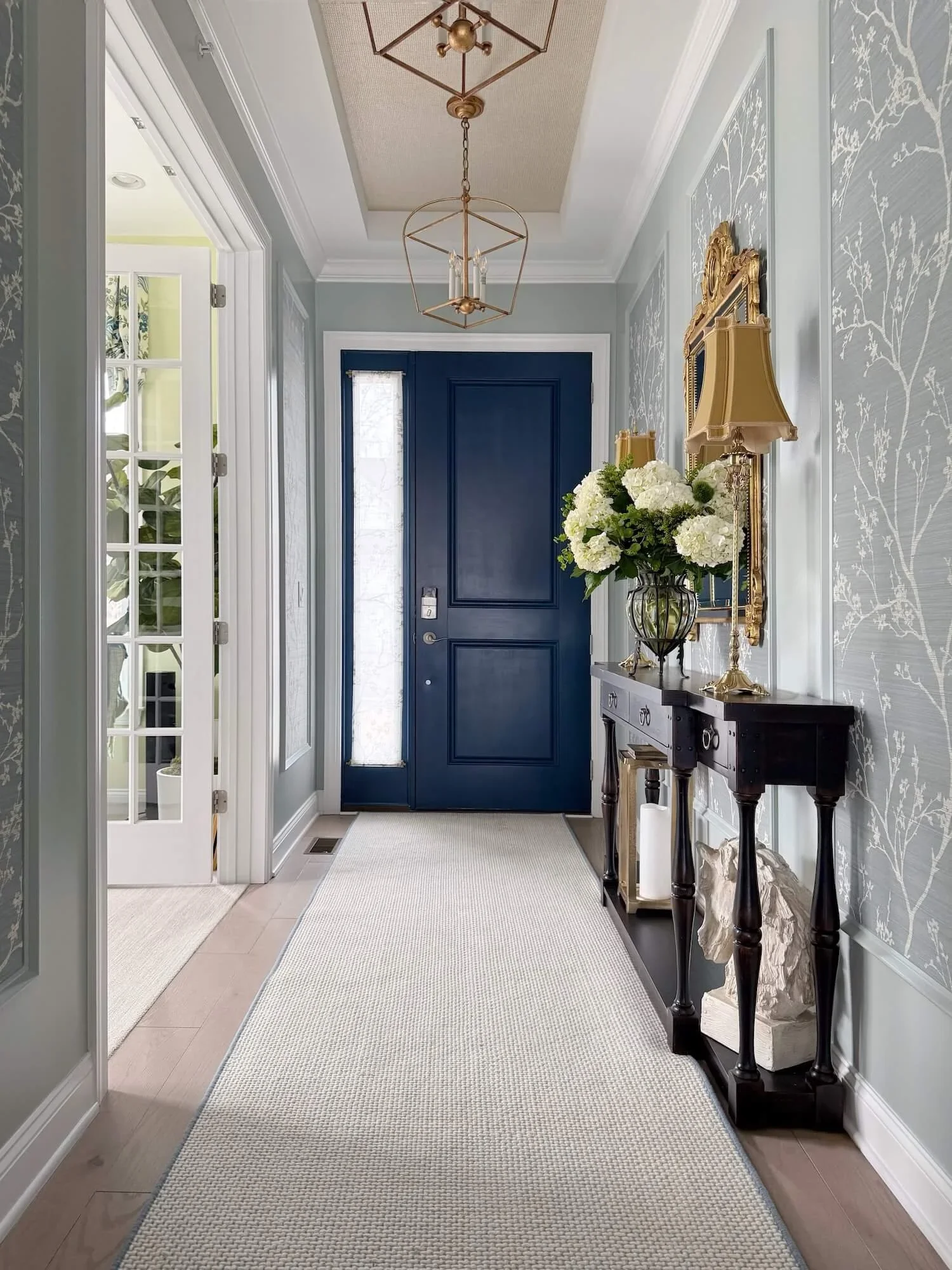 This elegant foyer project (before and after pictures HERE) used framed painted grasscloth panels and a wallpapered ceiling to transform this builder basic space into something spectacular.